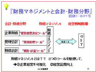 3つの会計・財務分野(財務会計・管理会計・企業財務)を財務マネジメントが総合的に束ねて、経営の3つの階層OST(Objective:目的、Strategy:戦略、Tactics:戦術)をサポートします。