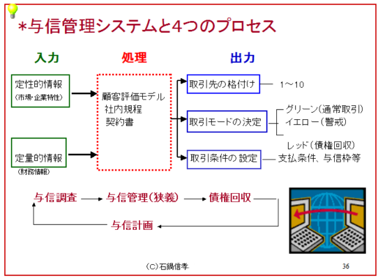 戦略的与信管理は、与信計画→与信調査→与信管理(狭義)→債権回収の4つのプロセスから構成され、システムとして、入力→処理→出力部より構成されます。